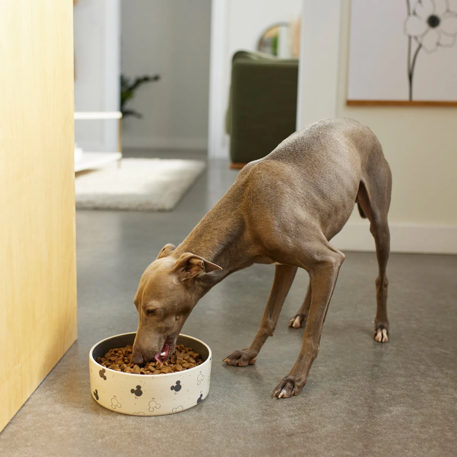 - Dog and cat bowl with a modern, watercolor-silhouette Mickey Mouse pattern.
